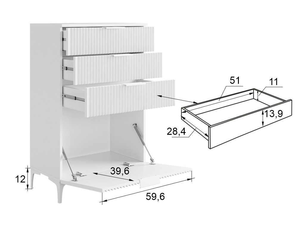 Состоит из: 3-х ящиков и нижней откидной барной секции.