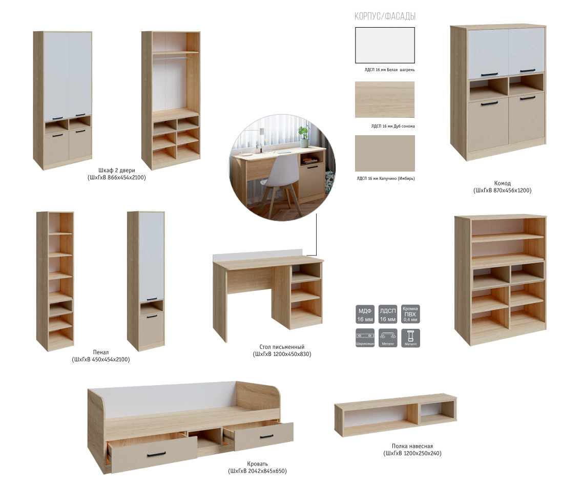 Цена за комплект: Пенал, Кровать, Комод, Шкаф, Стол, Полка (2 шт)