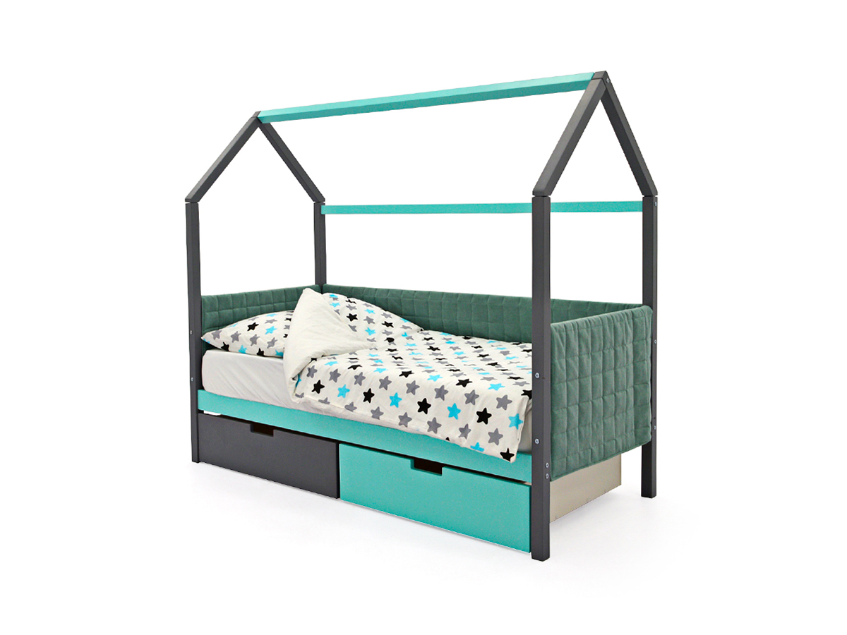 - Кровать-домик мягкий Svogen с ящиками графит-мятный