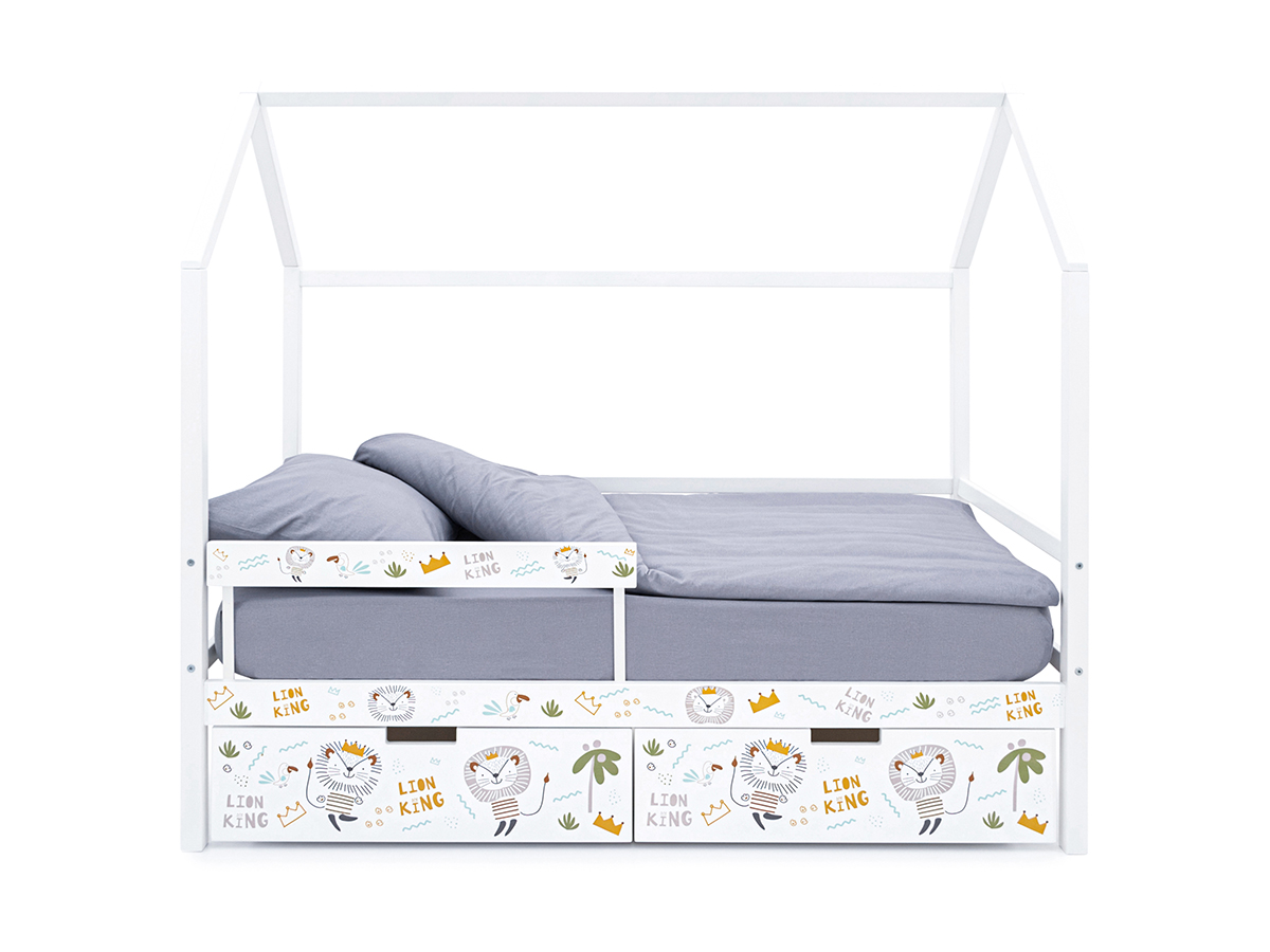 Кровать-домик Svogen с фото с ящиками и бортиком белый/львята