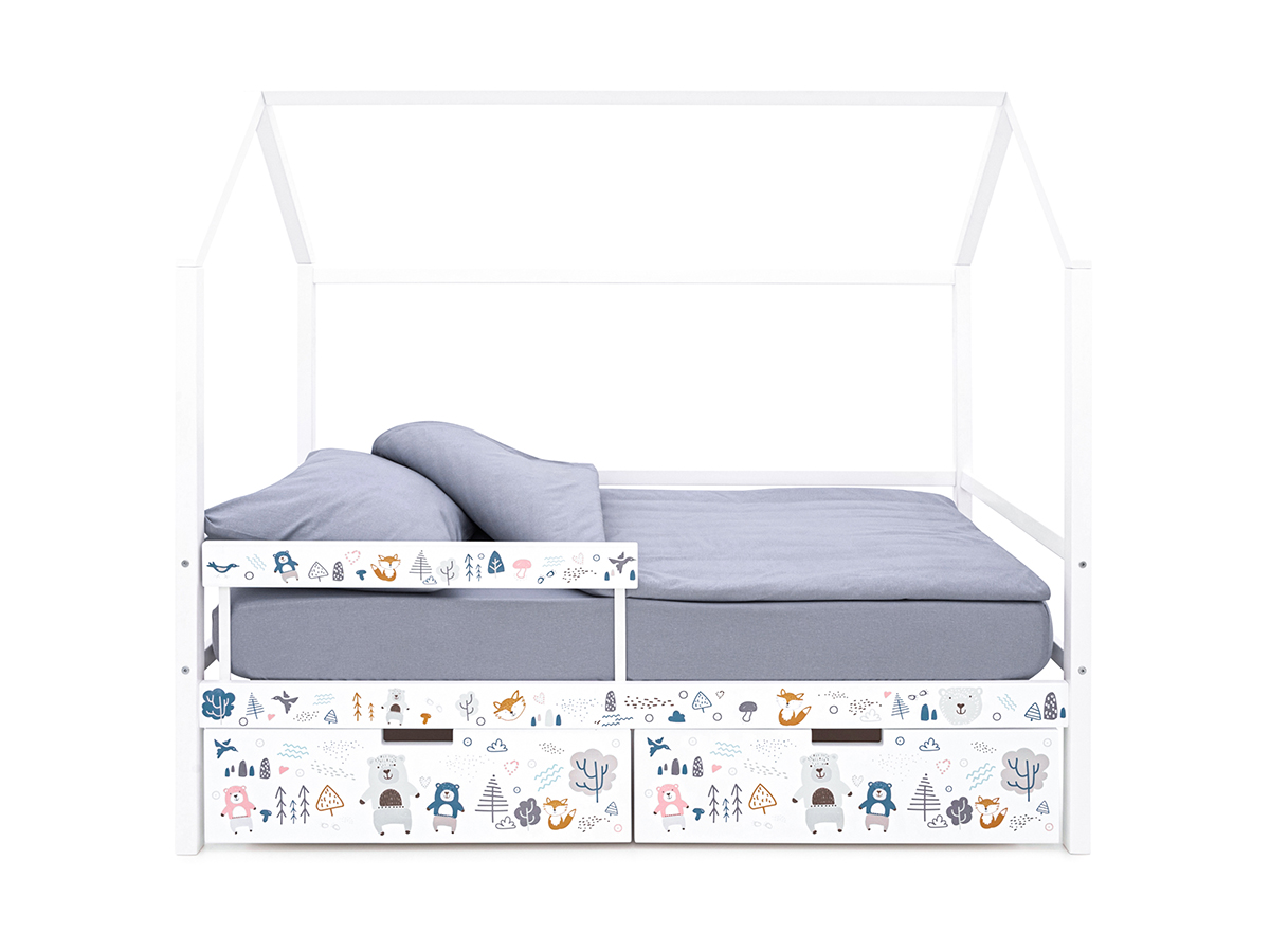 - Кровать-домик Svogen с фото с ящиками и бортиком белый/мишки
