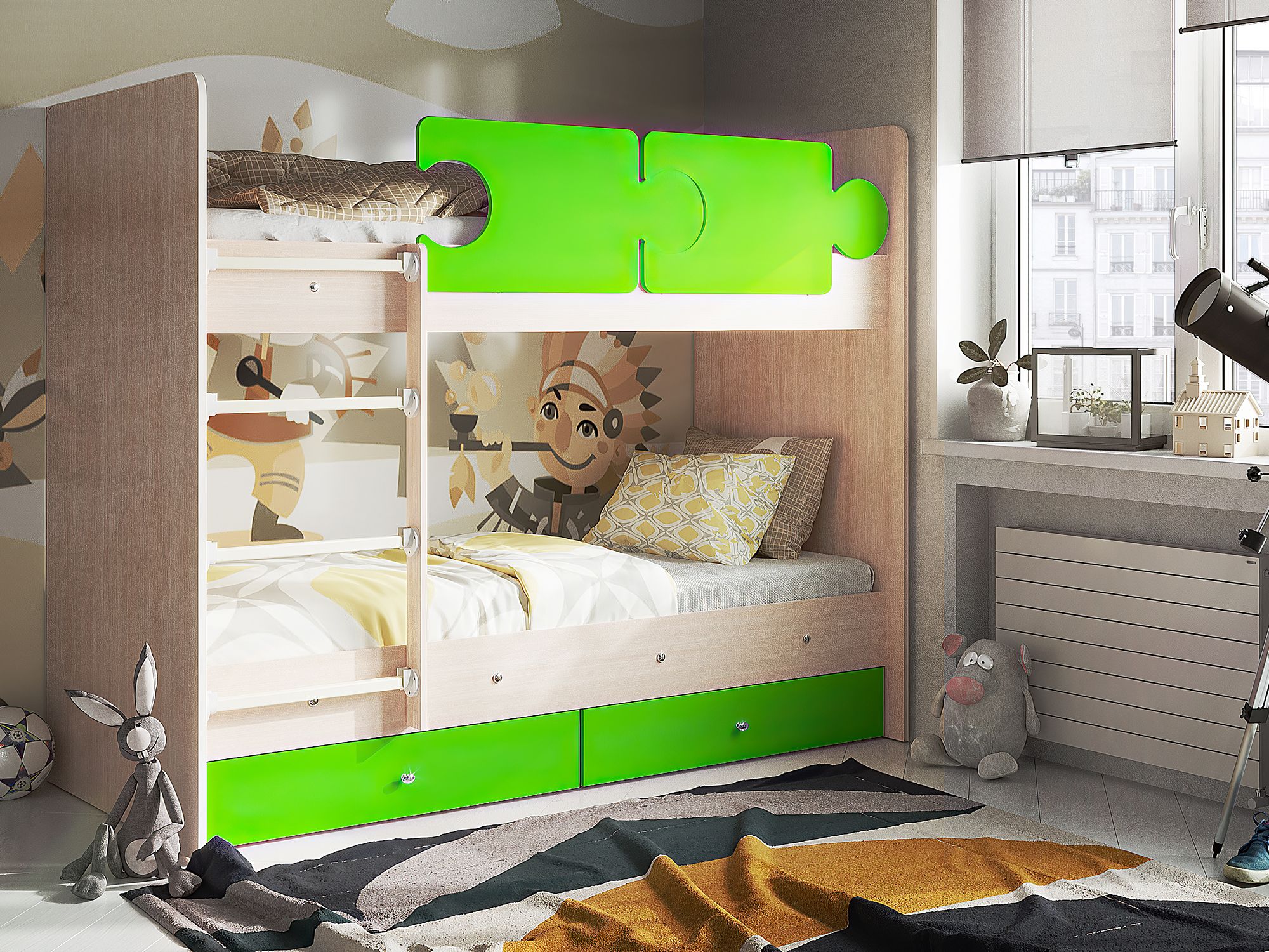 Кровать двухъярусная Тетрис латы с бортиками дуб млечный-лайм
