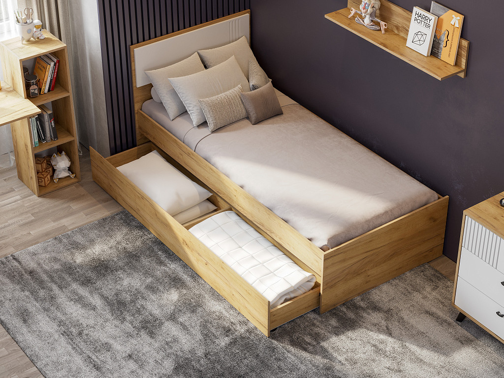 В комплект входит: Кровать одинарная + Основание под матрац 0,9*2,0м (ЛДСП) + Ящик для кровати