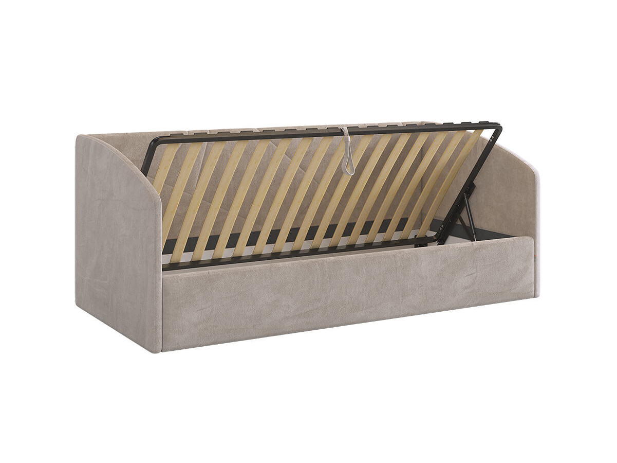 Основание подъемное входит в комплект кровати, петелька для подъема в цвет ткани на корпусе. Кровать имеет огромный ящик для хранения.