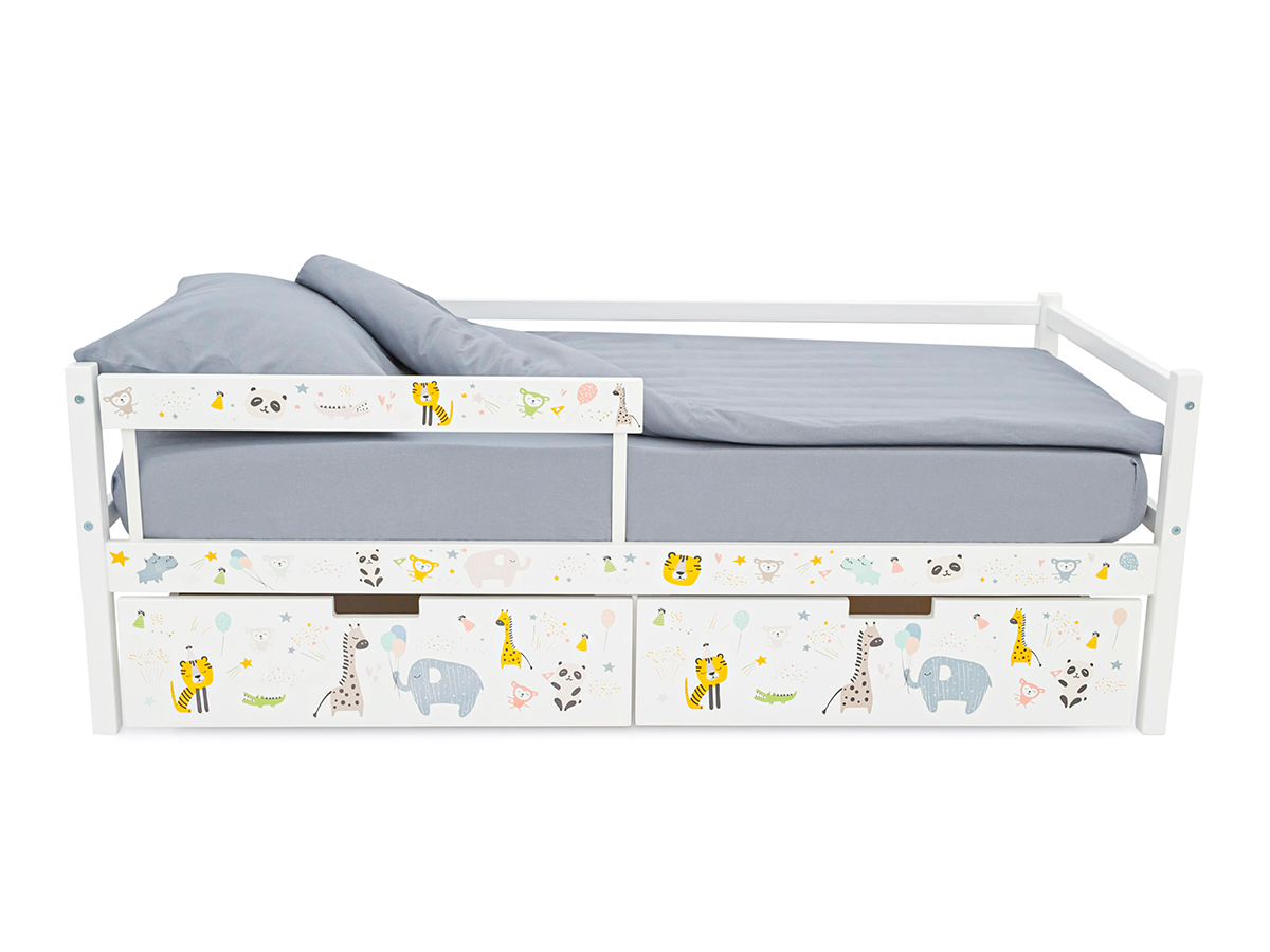 Кровать-тахта Svogen с ящиками и бортиком с фотопечатью белый/зверята