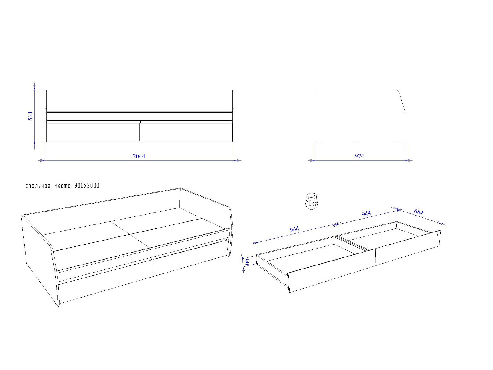 Спальное место: 900*2000 мм