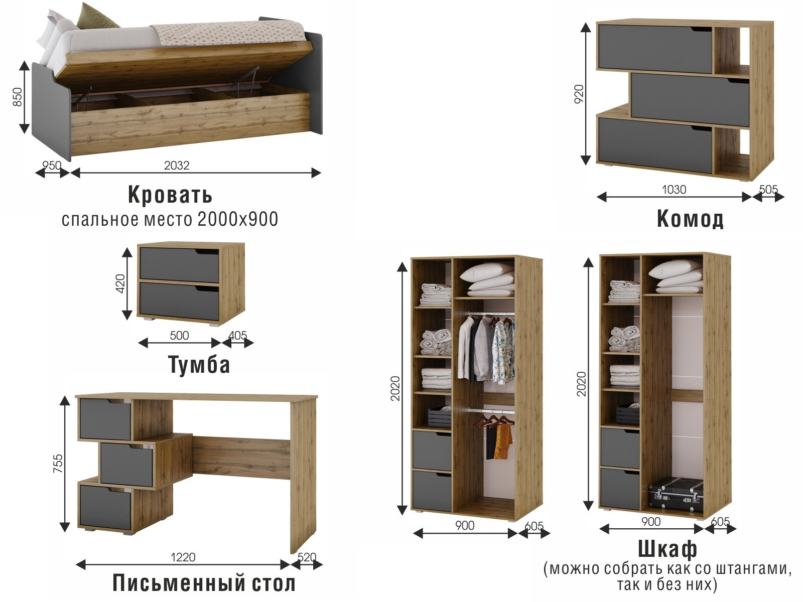 Цена за модули: кровать, шкаф, стол, комод, тумба