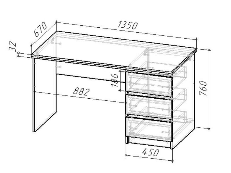 Стол письменный СП-001 состоит из тумбы с 3-мя ящиками, рабочего места и крышки стола: