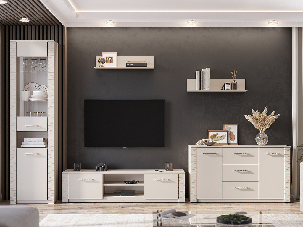 Цена за комплект: Тумба ТВ 1600, Пенал со стеклом, Полка навесная (комплект), Комод 3 ящика двухстворчатый