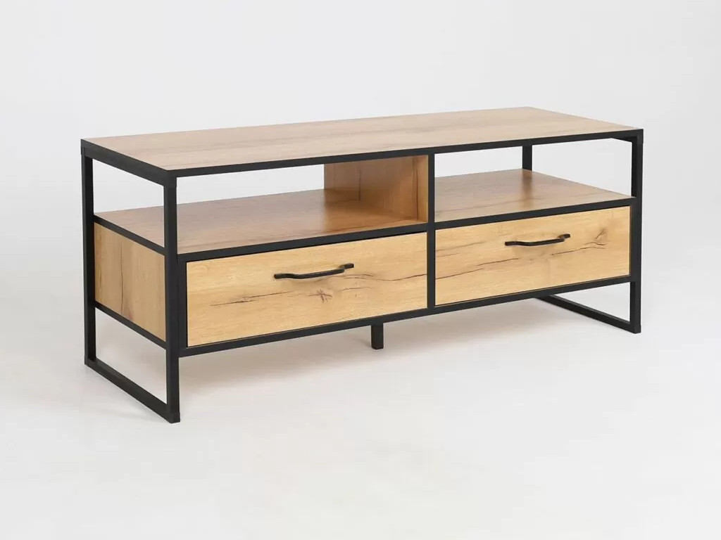 Тумба состоит из 2-х выкатных ящиков, вместительных пололок для ваших вещей и предметов декора.