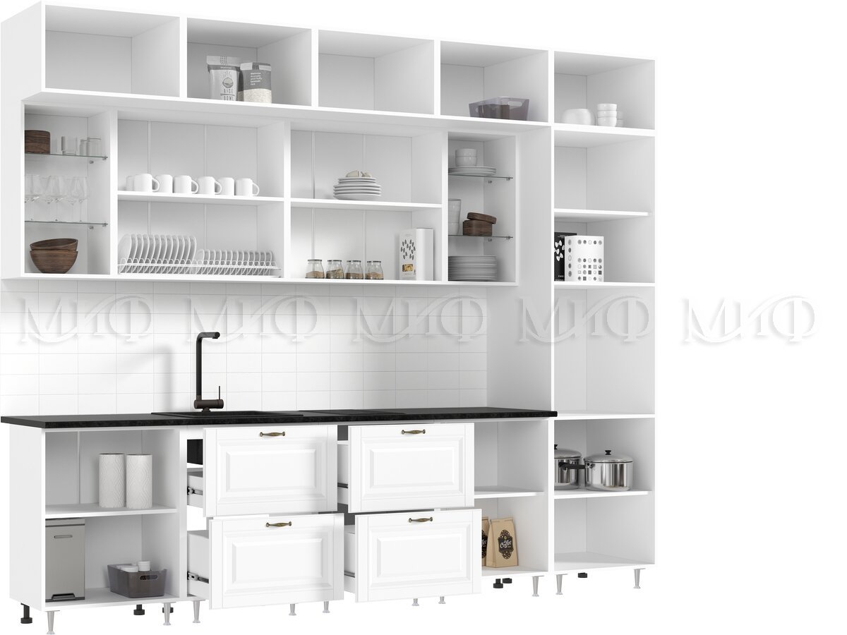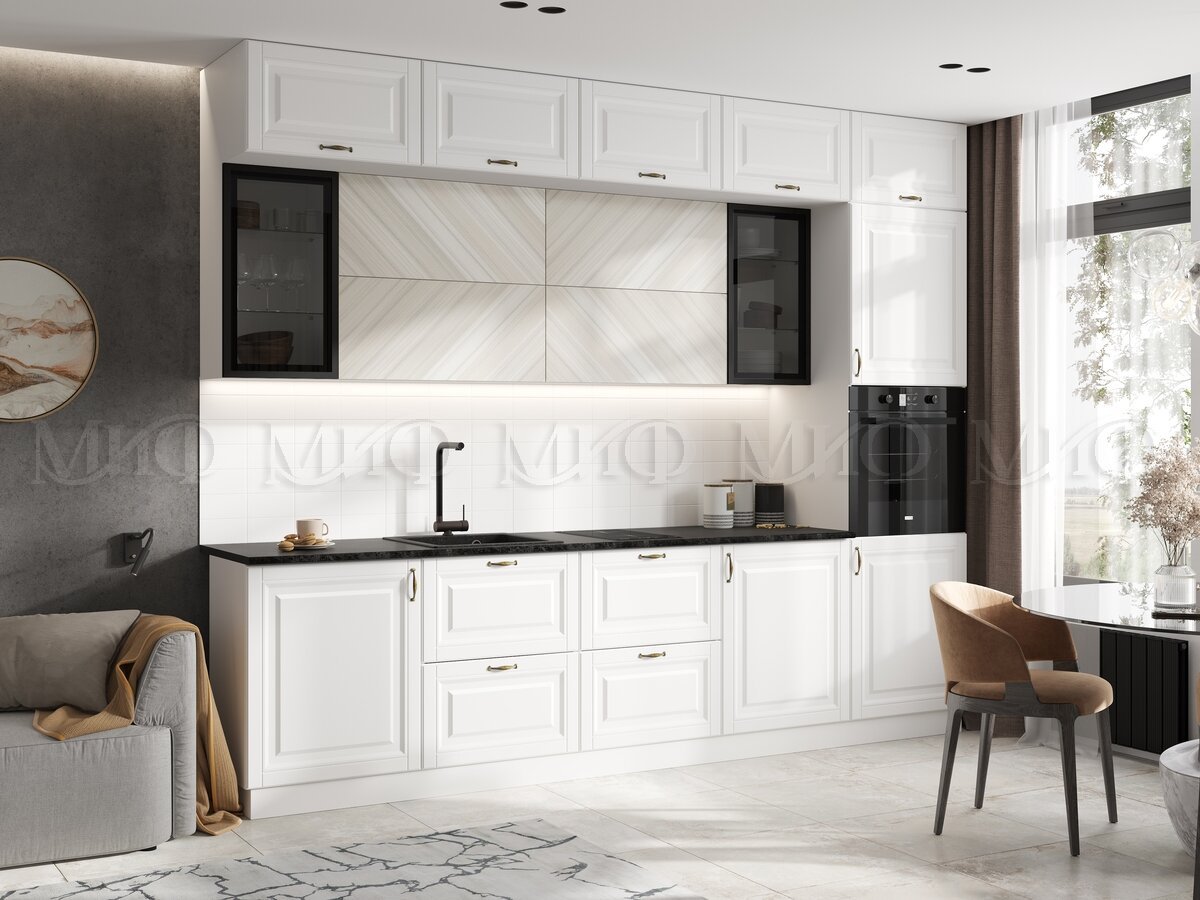 - Кухня Престиж 3000 мм Компоновка №2 Браш Вайт/Прайм жемчуг
