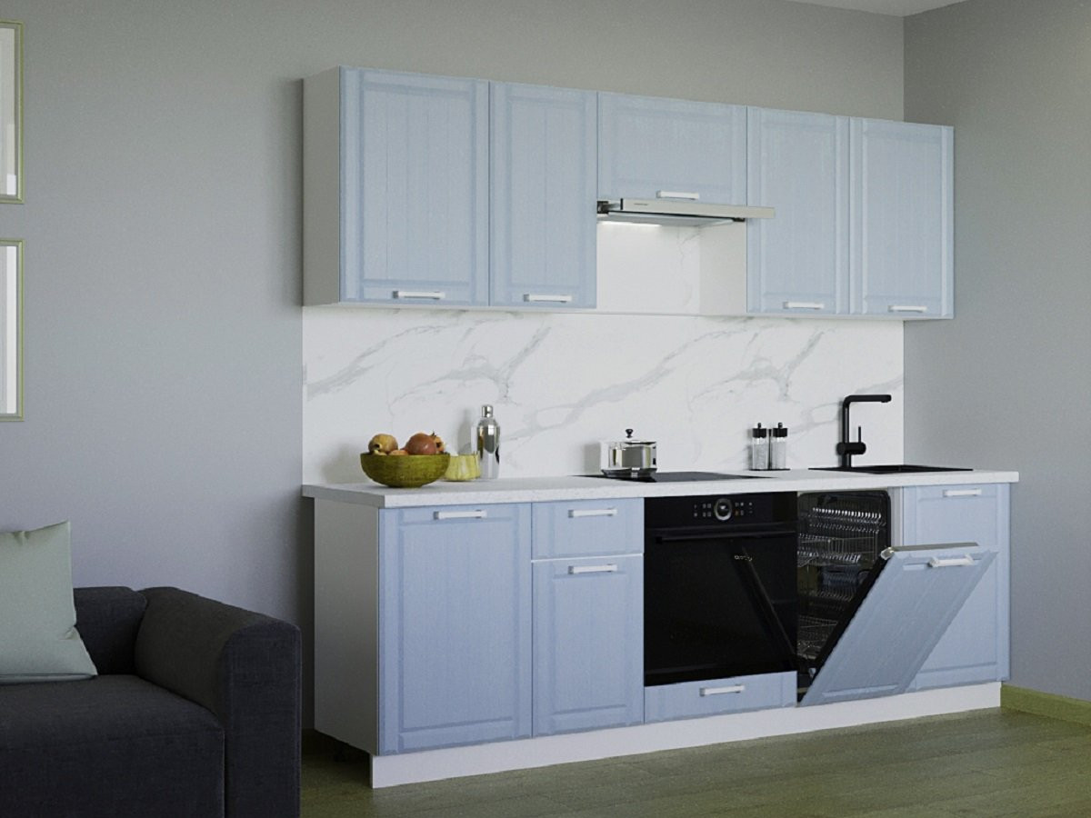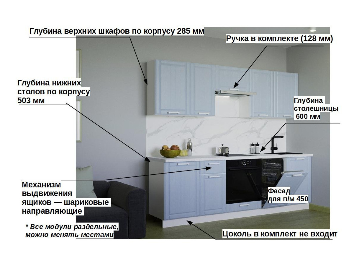 Кухонная мойка, стеновая панель, посудосушитель, планки для столешницы в комплект не входят.