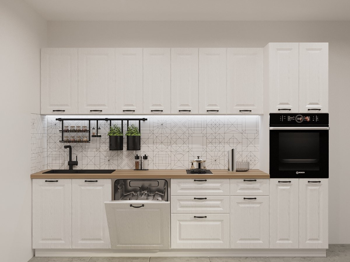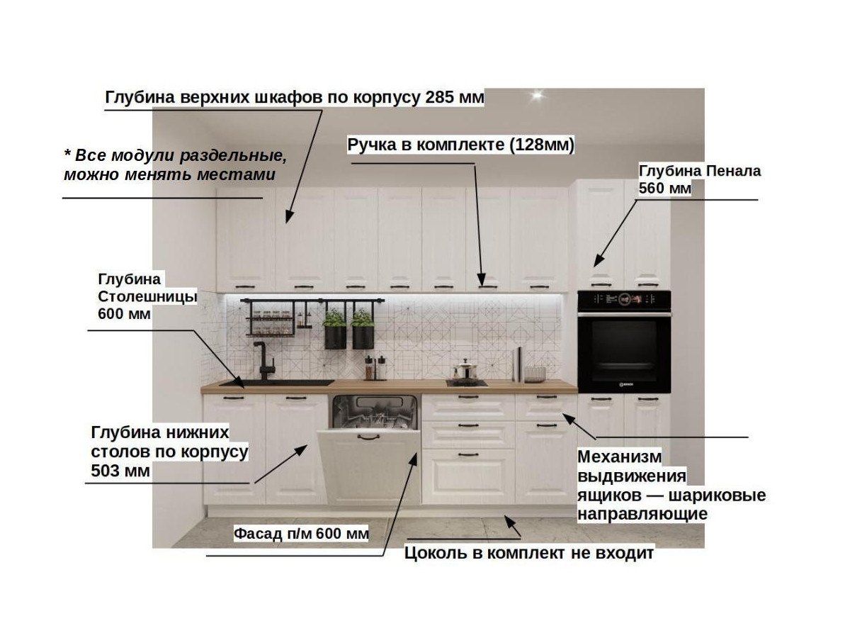 Кухонная мойка, стеновая панель, посудосушитель, планки для столешницы в комплект не входят.