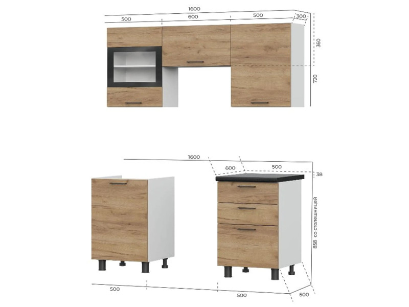 • Низ (с учетом высот столешницы) 1600х858х600мм