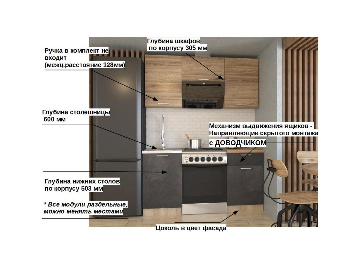 Кухонная мойка, стеновая панель, посудосушитель, планки для столешницы в комплект не входят.