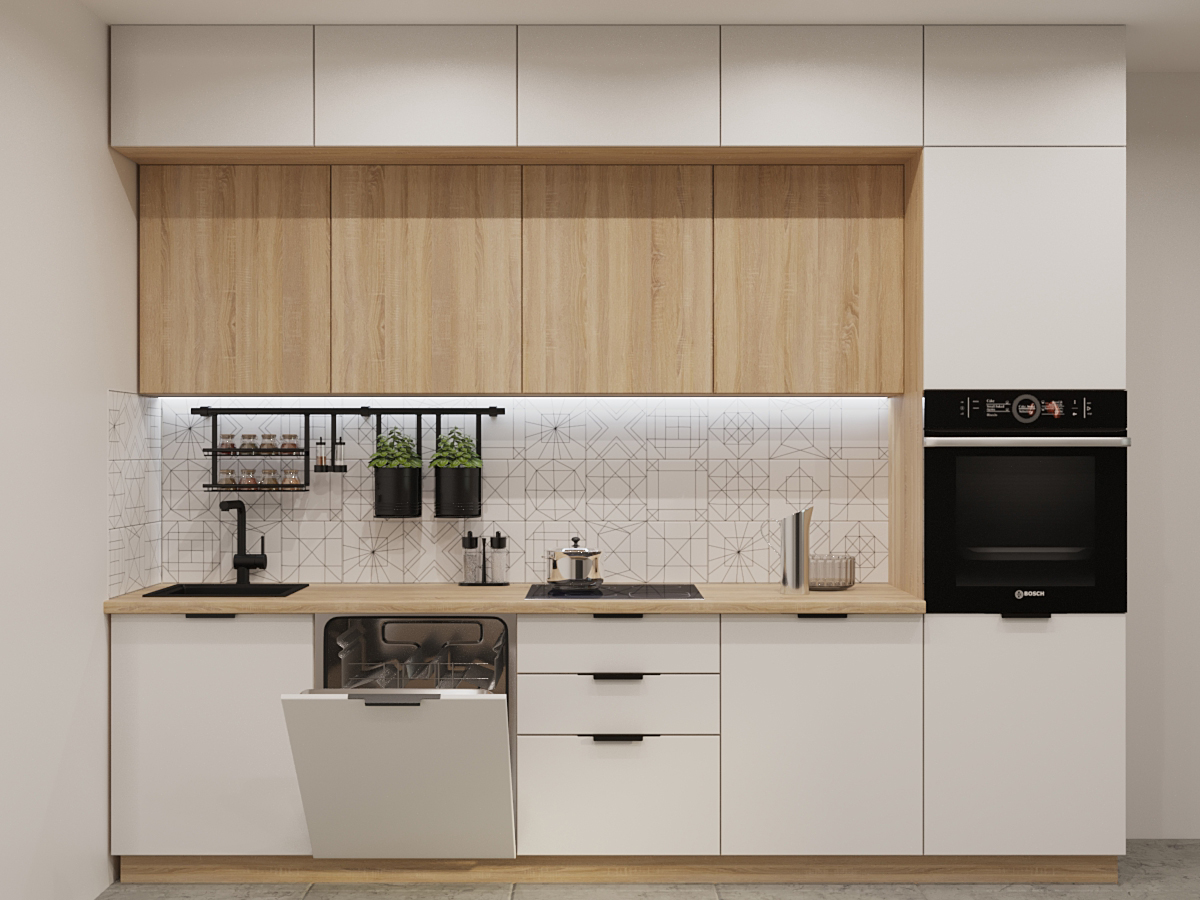 Кухонная мойка, стеновая панель, посудосушитель, планки для столешницы в комплект не входят.