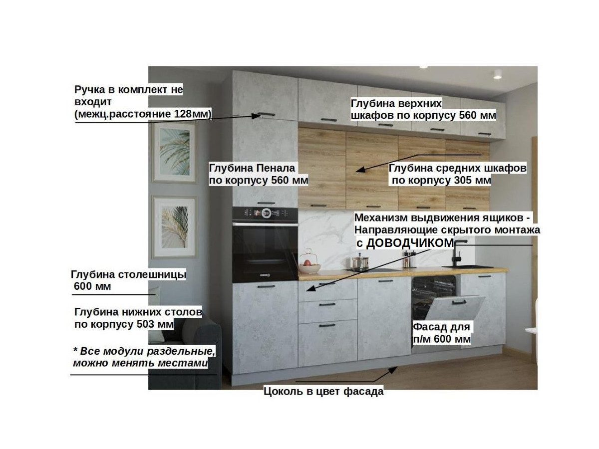 Кухонная мойка, стеновая панель, посудосушитель, планки для столешницы в комплект не входят.