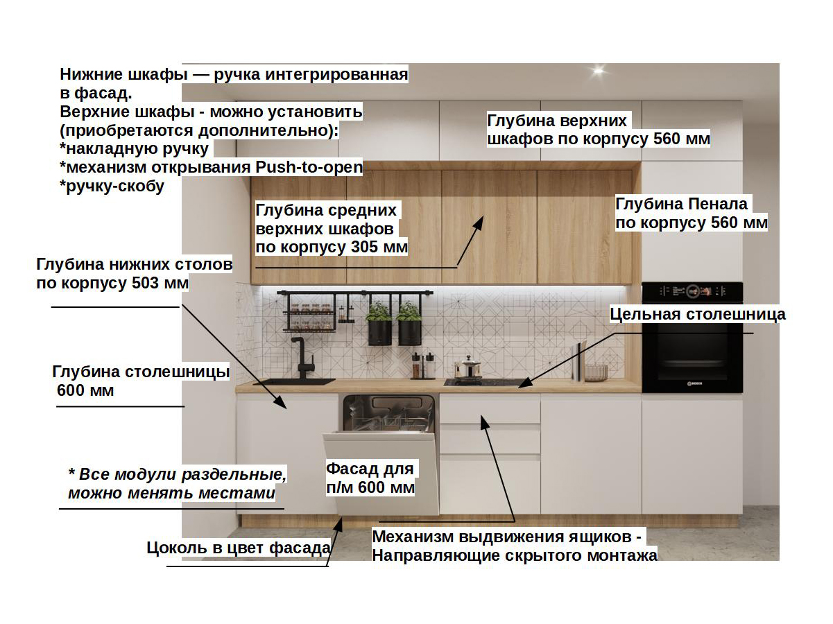 Кухонная мойка, стеновая панель, посудосушитель, планки для столешницы в комплект не входят.