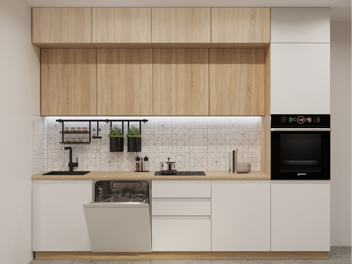 Кухонная мойка, стеновая панель, посудосушитель, планки для столешницы в комплект не входят.