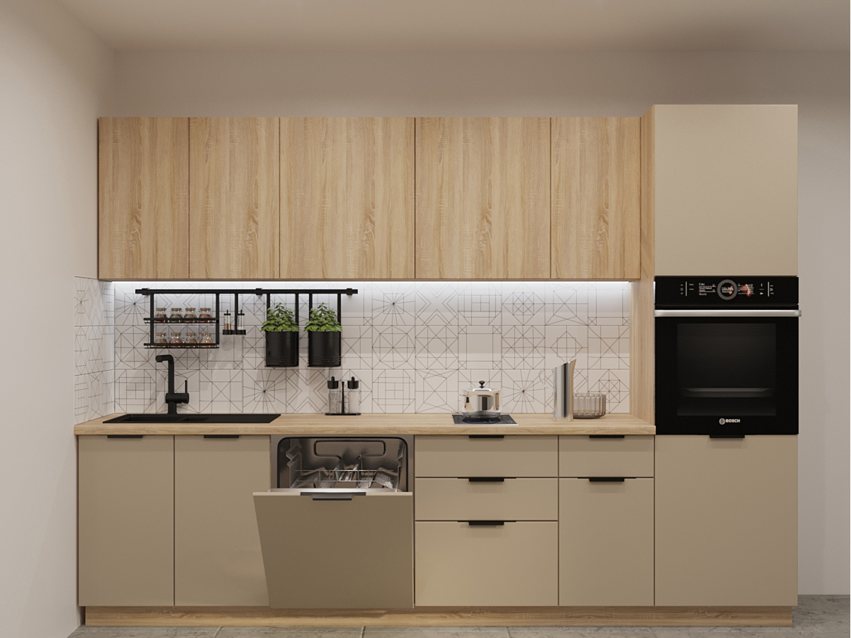Кухонная мойка, стеновая панель, посудосушитель, планки для столешницы в комплект не входят.