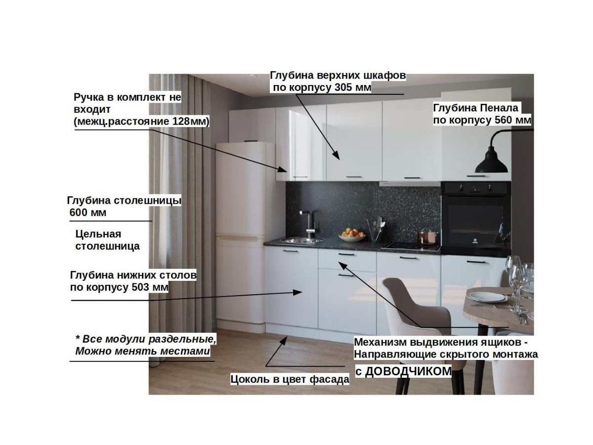 Кухонная мойка, стеновая панель, посудосушитель, планки для столешницы в комплект не входят.
