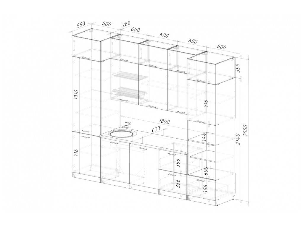Мойка, смеситель, стеновая панель и посудосушитель в комплект гарнитура не входят.
