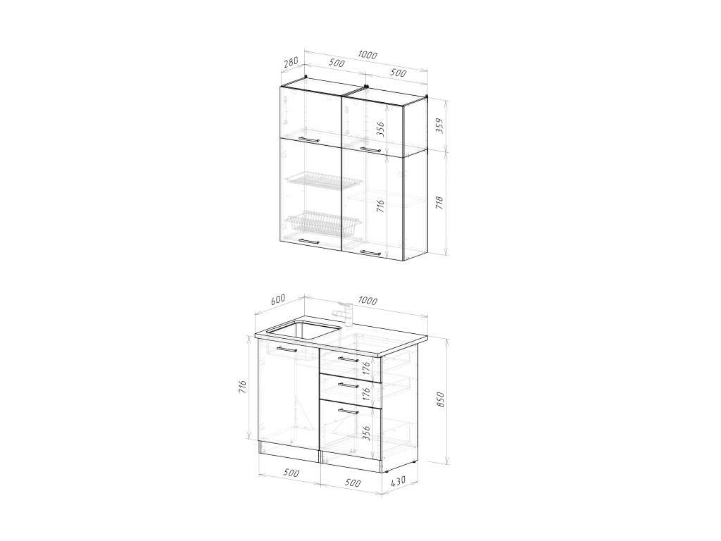 Мойка, смеситель, стеновая панель и посудосушитель в комплект гарнитура не входят.