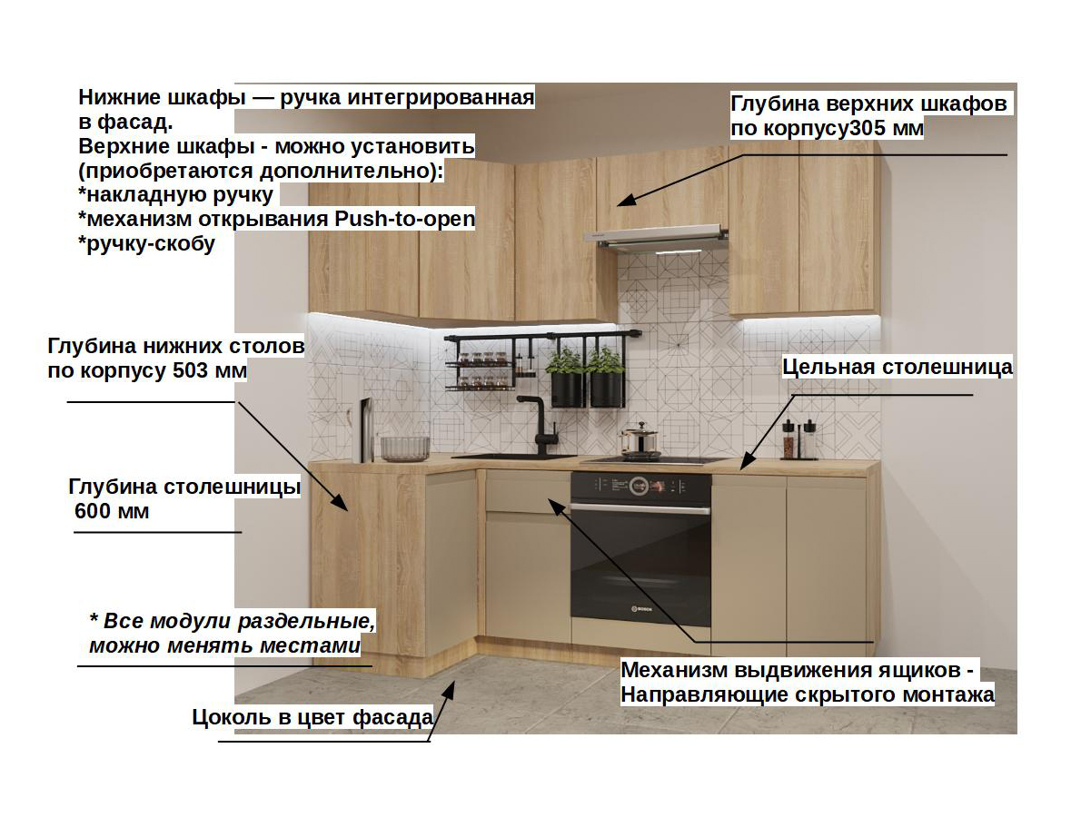 Кухонная мойка, стеновая панель, посудосушитель, планки для столешницы в комплект не входят.
