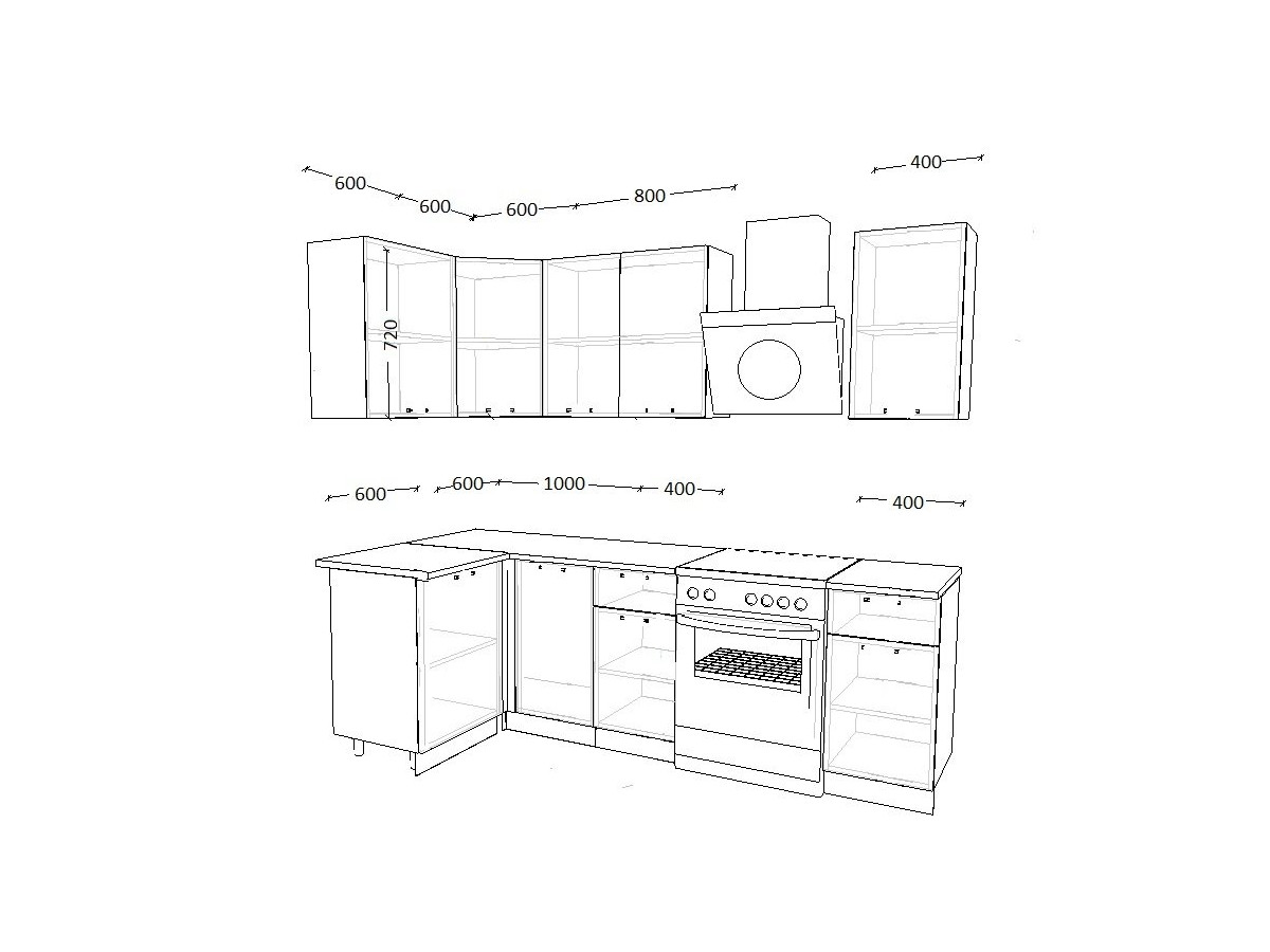 - высота верхних шкафов 720 мм