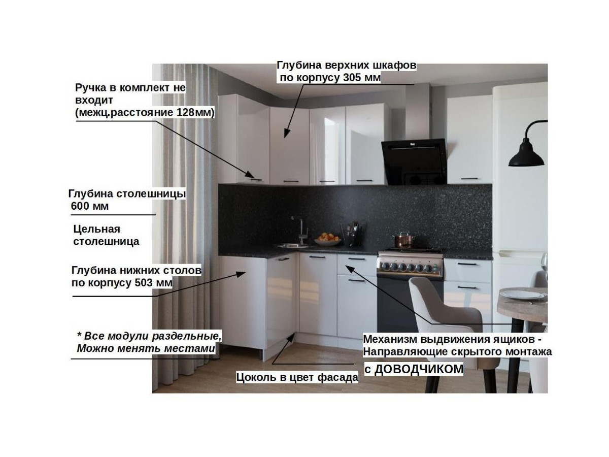 Кухонная мойка, стеновая панель, посудосушитель, планки для столешницы в комплект не входят.