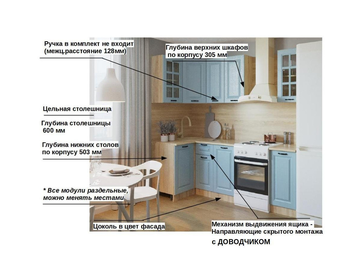 Кухонная мойка, стеновая панель, посудосушитель, планки для столешницы в комплект не входят.