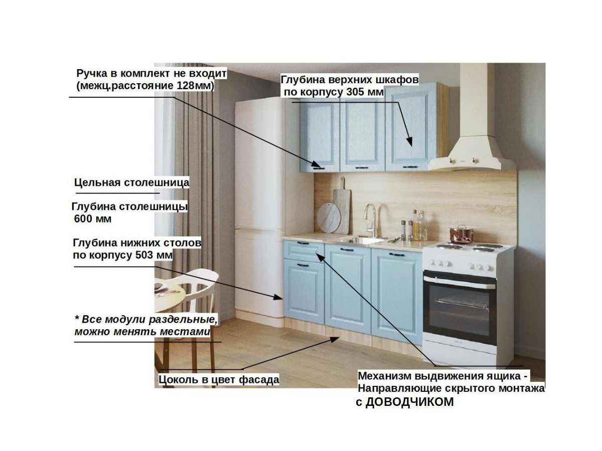 Кухонная мойка, стеновая панель, посудосушитель, планки для столешницы в комплект не входят.