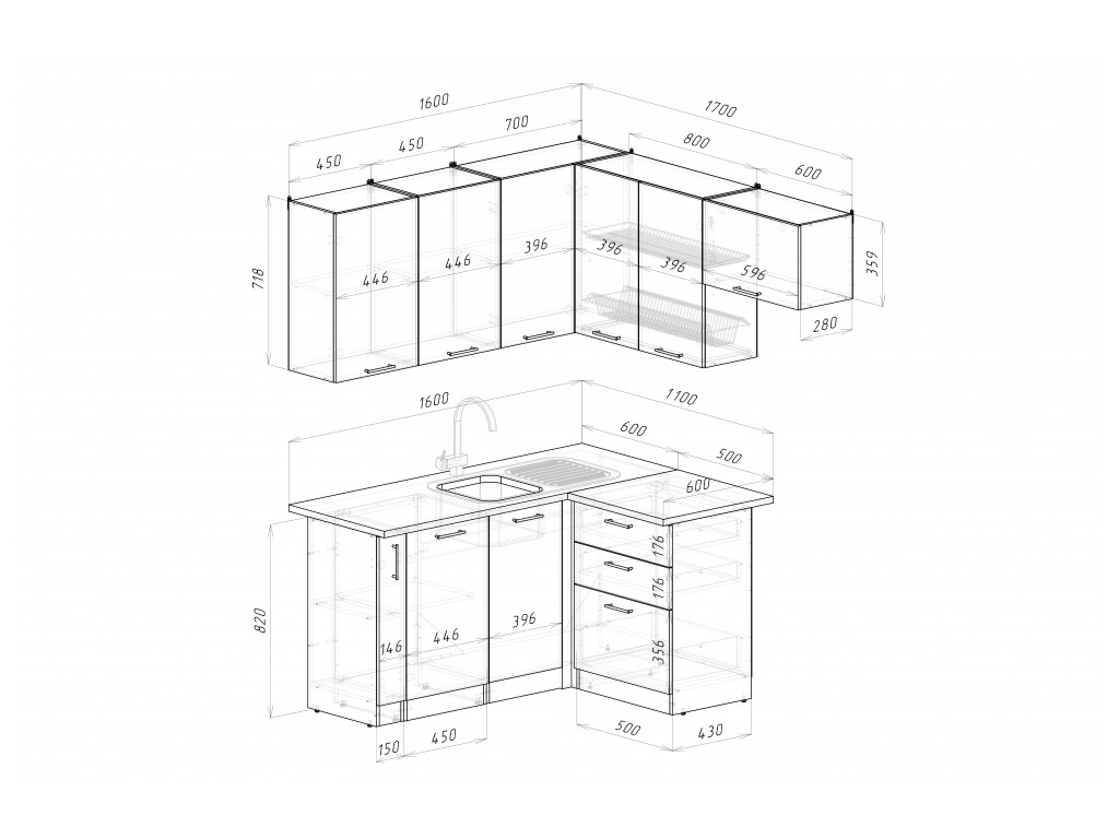 Мойка, смеситель, стеновая панель и посудосушитель в комплект гарнитура не входят.