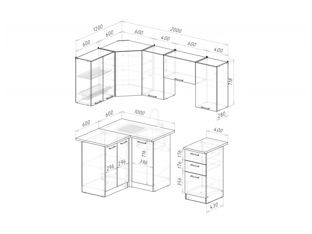 Мойка, смеситель, стеновая панель и посудосушитель в комплект гарнитура не входят.