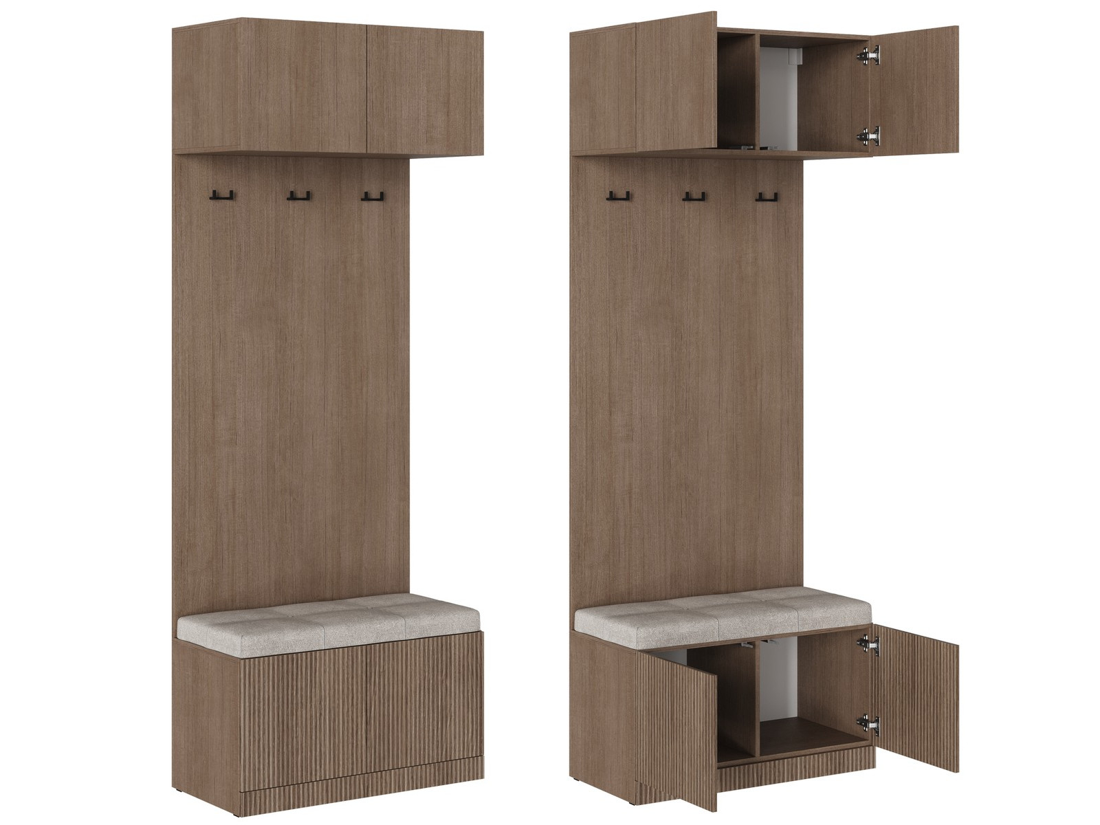 2) Средняя часть шкафа представляет собой Щит из ЛДСП – на двух врезных навесах. На щите располагаются три двойных крючка В-5 (АЛДИ), цвет Чёрный, материал пластик. Расстояние до крючков: от пола – 1862 мм, от сидушки – 1333 мм.
