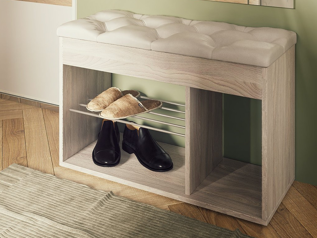 Удобный мягкий элемент и открытые ячейки делают её идеальной для небольшой прихожей. Основные ниши предназначены для кроссовок, туфель и тапочек, боковая же ниша — для более высокой обуви. А под откидной верхней крышкой — ниша для перчаток, зонтика, крема для обуви или других полезных мелочей, необходимых при выходе из квартиры.