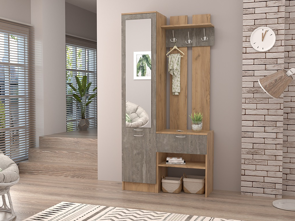 Прихожая имеет простой дизайн и прямые формы. Она состоит из вешалки с тумбой и пенала. Открытая вешалка оборудована полкой для головных уборов, тремя 3-х рожковыми крючками для одежды, ниже выдвижной ящик на роликовых направляющих, под ним открытая ниша с полкой. За распашными дверьми пенала три полки. Тип сборки и направление открытия дверей определеяется при сборке.