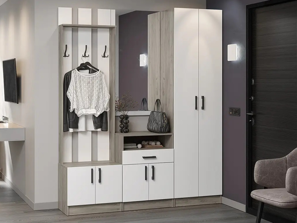 Цена указана за комплектацию на фото: ВШ-2 Вешалка, ЗН Зеркало навесное, ТБ-1 Тумба с ящиком, ШК-2 Шкаф 2-створчатый