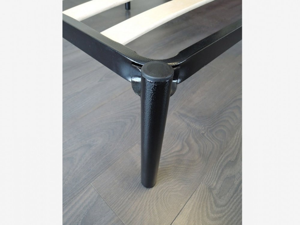 Каркас кровати изготовлен из металлического профиля сечением 40*20 мм. Несущие элементыв в основаниях - березовые латофлексы 53*8 мм, установленные с шагом 79 мм. Основание укомплектовано врезными латодержателями для боковин и накладными - для центральной перекладины, Распределенная статическая нагрузка на одно спальное место составляет 120 кг. Для фиксации матраца на основании кровати предусмотрены матрасодержатели. Их можно устанавливать как в изножье кровати, так и сбоку.