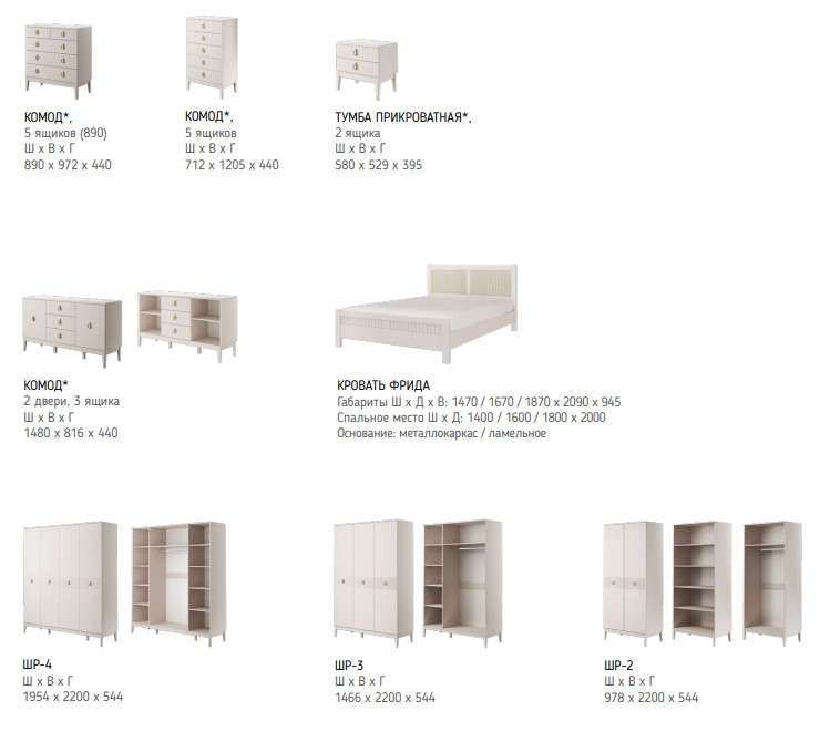 Цена указана за комплектацию на фото: Тумба прикроватная (2шт), Шкаф для одежды ШР-3, кровать Фрида 1400, Комплектующие на кровать с ламелями 1400