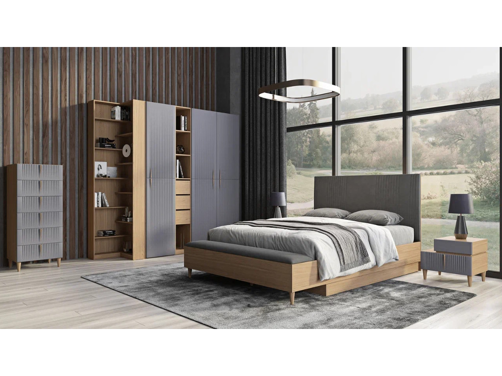 Цена за комплект: Кровать 1600 с банкеткой, Тумба прикроватная, Тумба малая, Комод 2 двери, Зеркало, Стол туалетный 1698