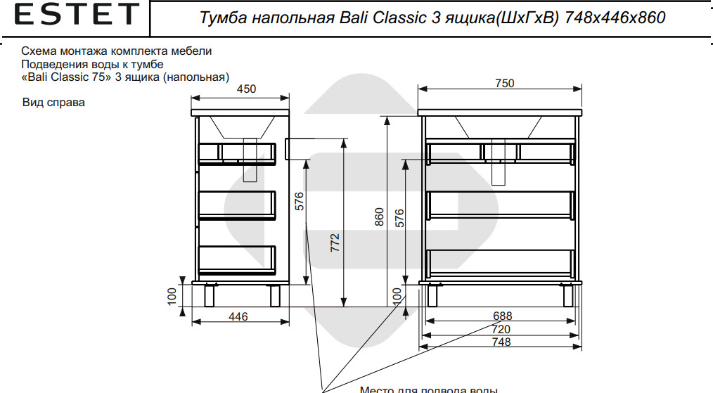 - Тумба с раковиной Bali Classic 750 напольная 3 ящика