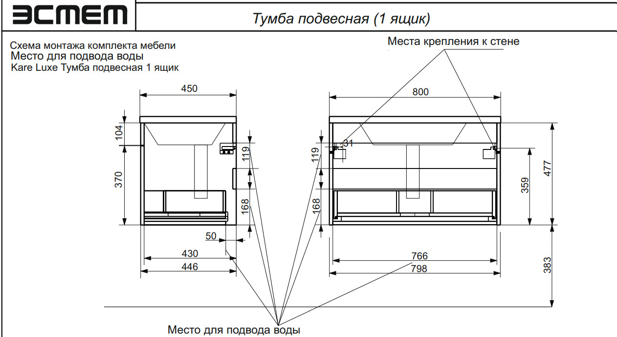 - Тумба с раковиной Kare Luxe 800 навесная 1 ящик