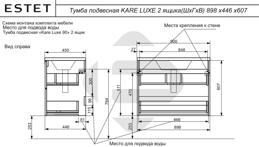 Тумба с раковиной Kare Luxe 900 навесная 2 ящика