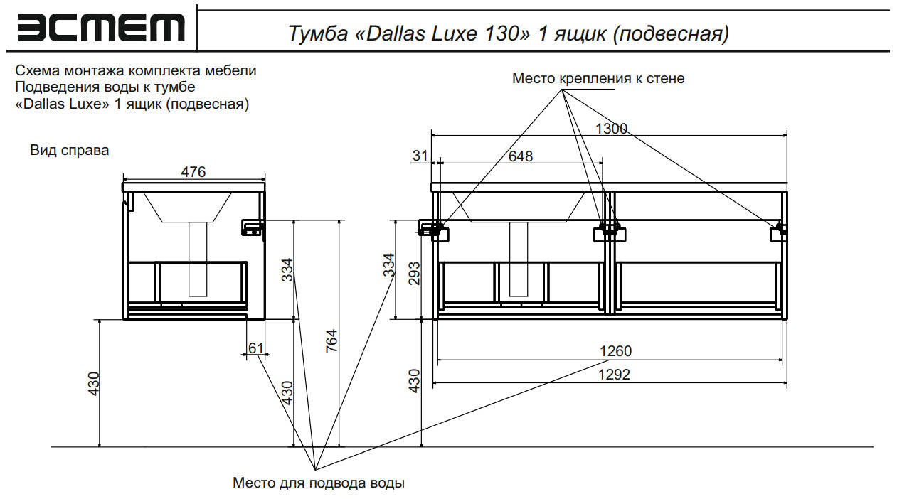 - Тумба с раковиной слева Dallas Luxe 1300 навесная 1 длинный ящик