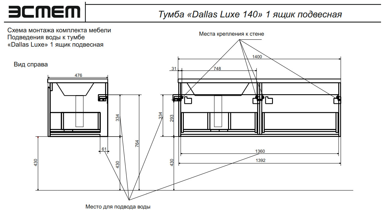 - Тумба с раковиной слева Dallas Luxe 1400 навесная 1 длинный ящик