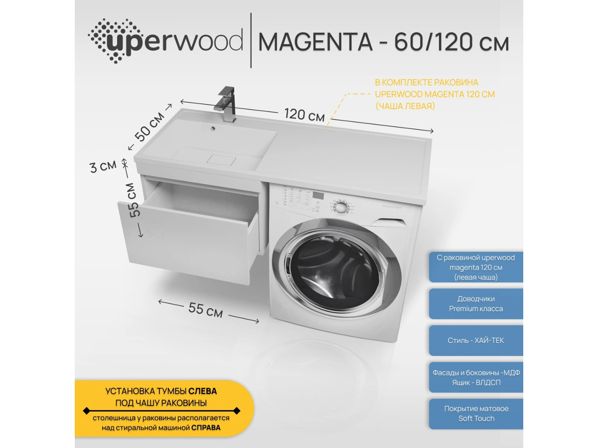 Тумба с раковиной Uperwood Magenta 60-120 см подвесная белая выдвижной ящик левая