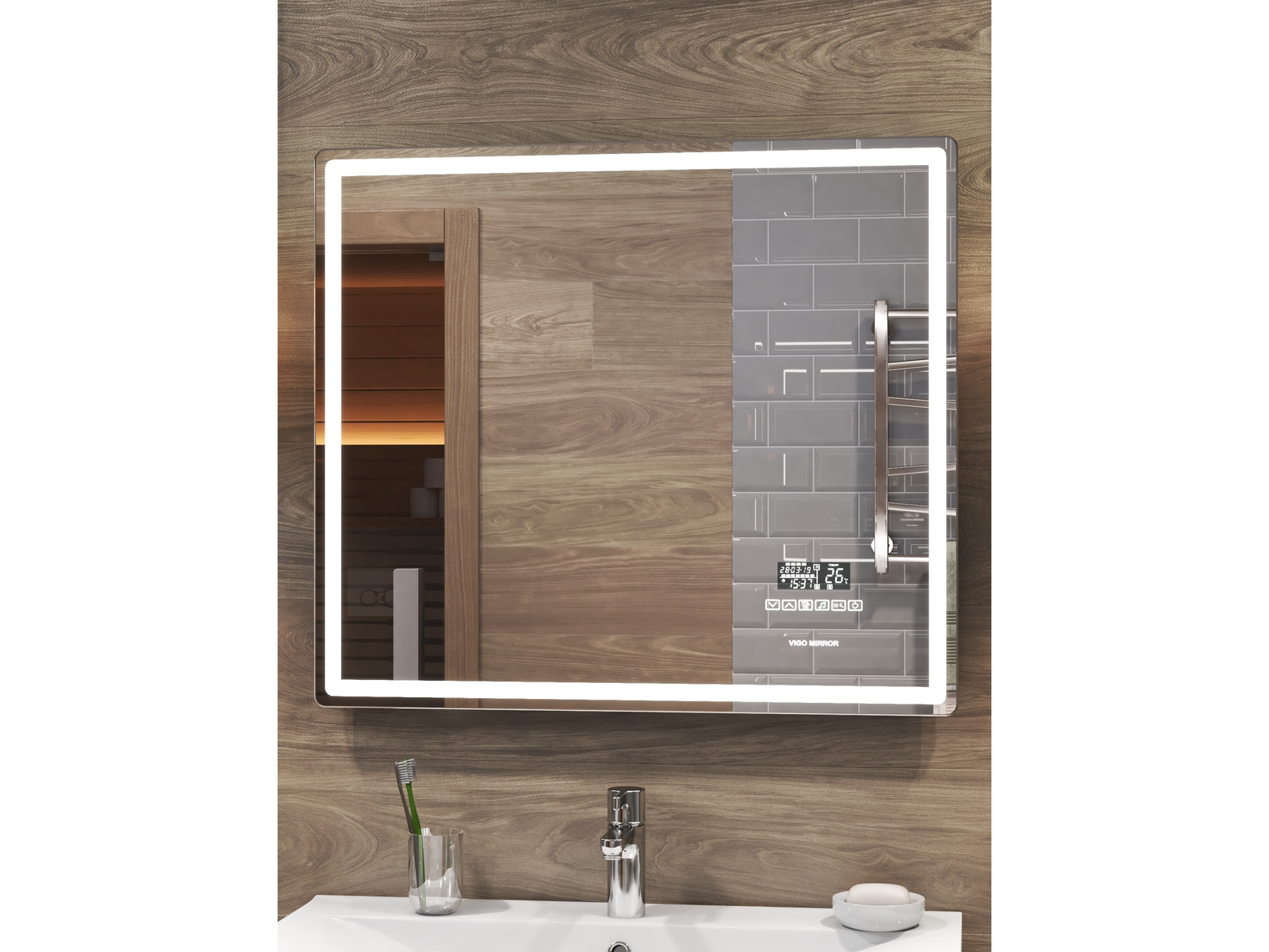 Оснащение: LED подсветка по периметру, сенсорное управление, часы, дата; функция
