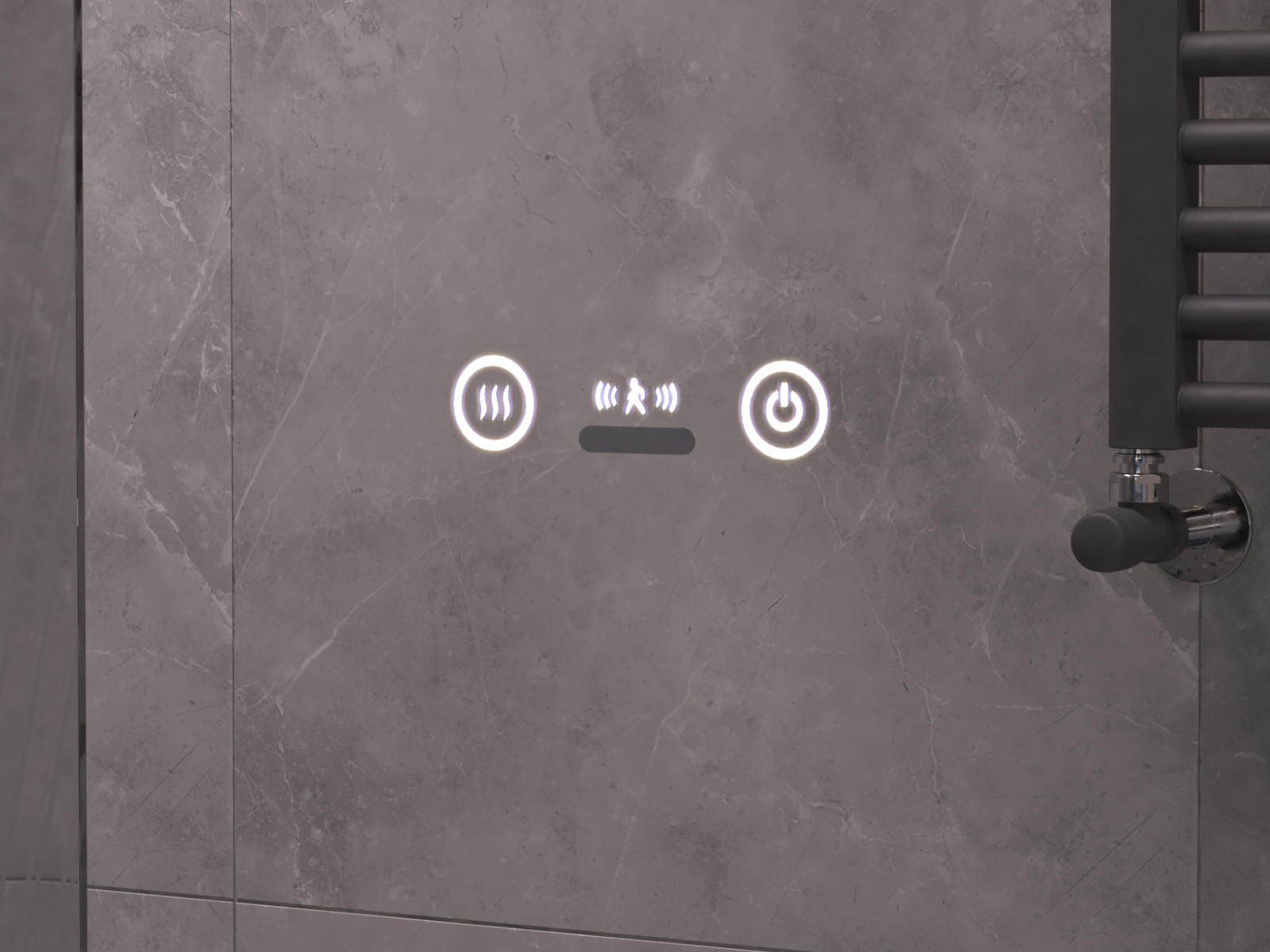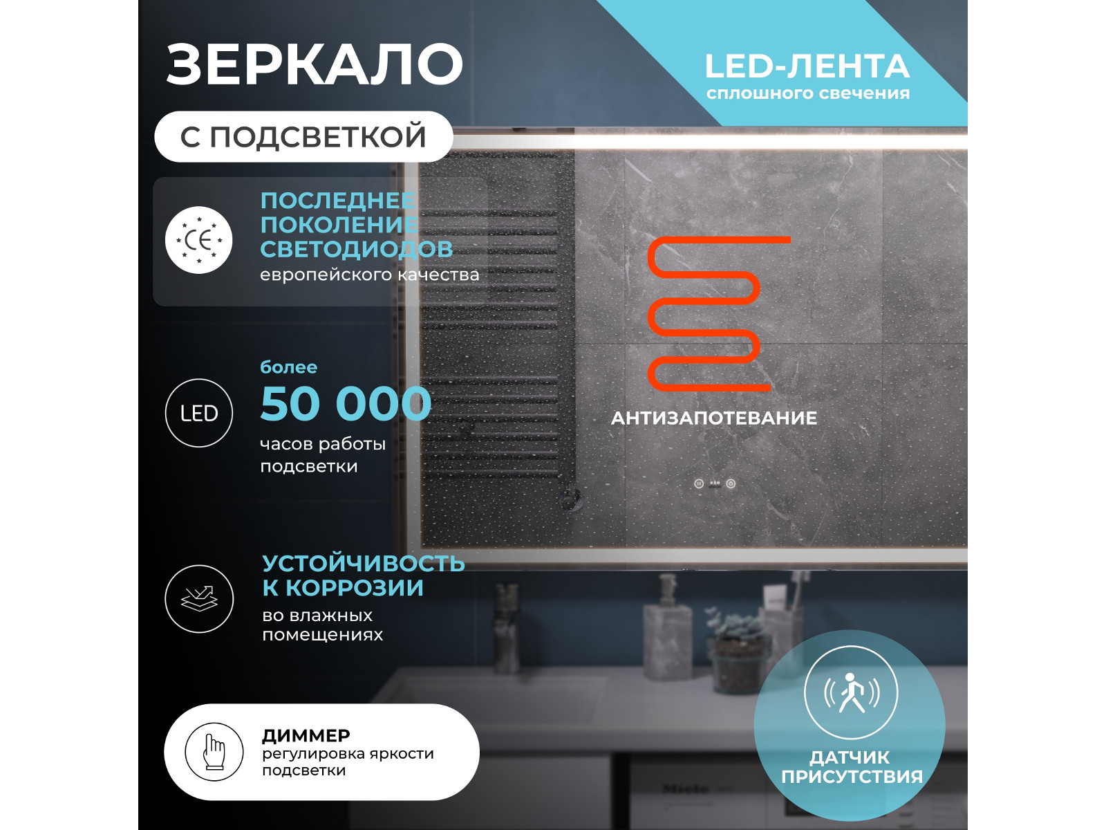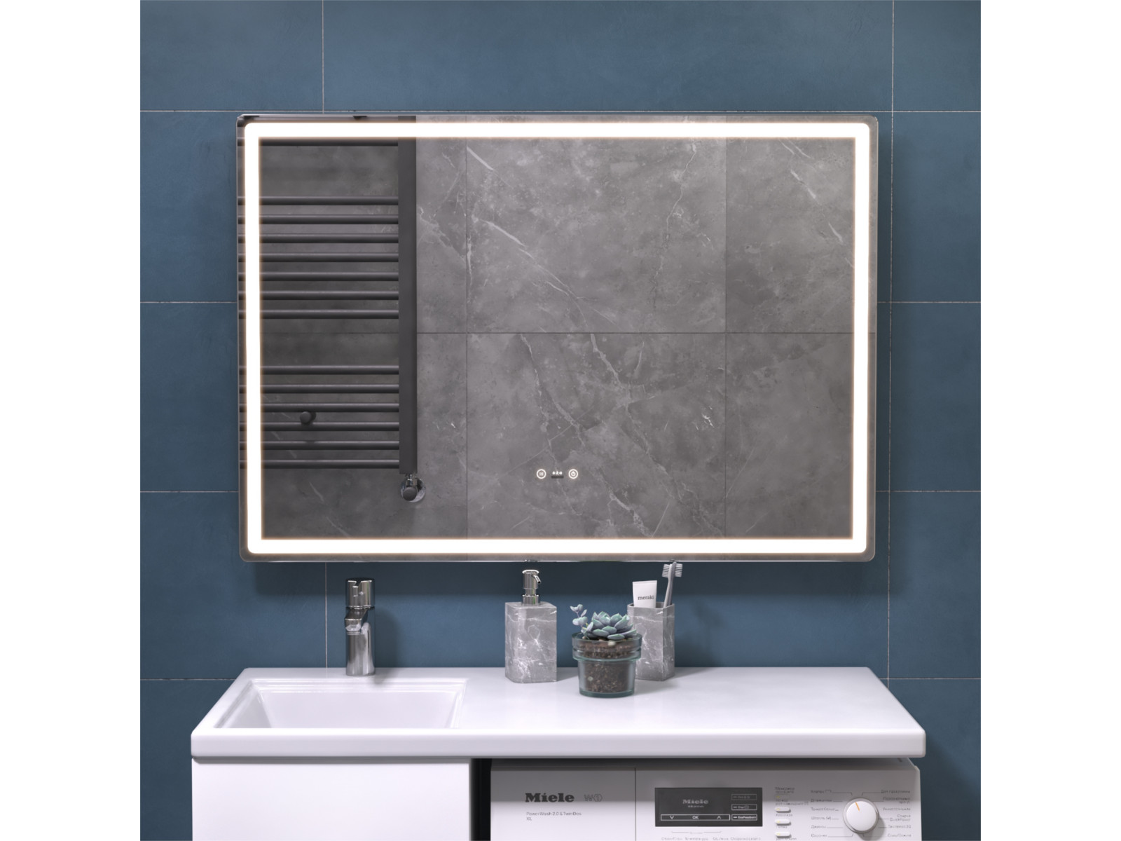 Подсветка фронтальная по периметру, с цветовой температурой 5000К – нейтральный белый, управление подсветкой сенсорное/датчик присутствия (1.5 м.)