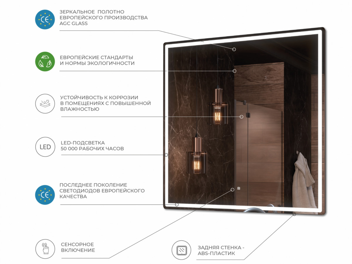 светодиодная подсветка по периметру; сенсорное управление; антизапотевание; включение на взмах
